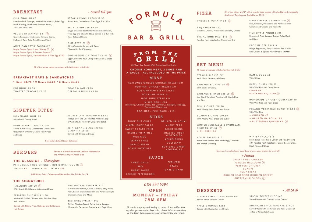 Step into the Formula Bar & Grill and enjoy a range of tasty options. We’re serving hearty breakfasts until 3 PM, along with a selection of burgers, classic mains, sides, snacks, hot and cold drinks throughout the day. All our food is prepared fresh, ensuring a satisfying meal every time you stop by.